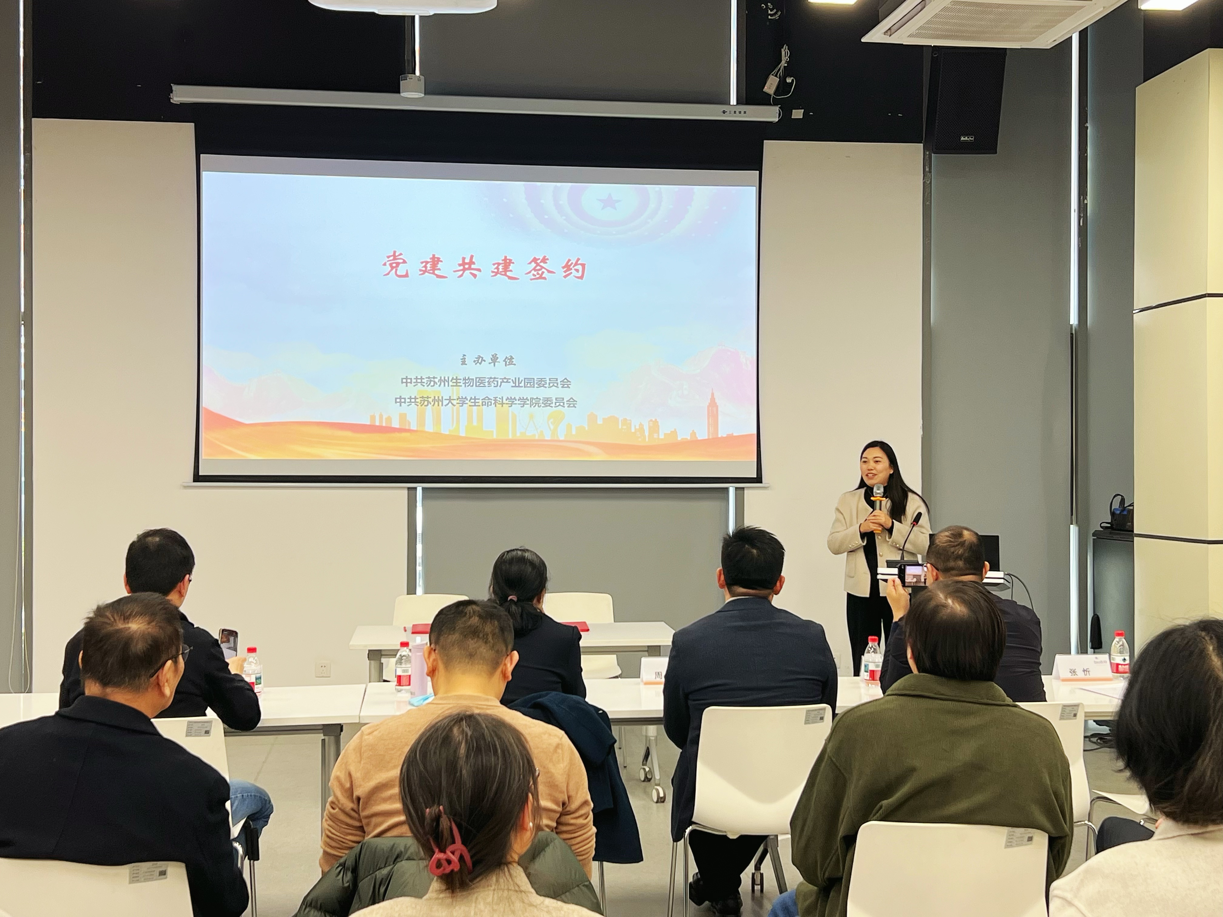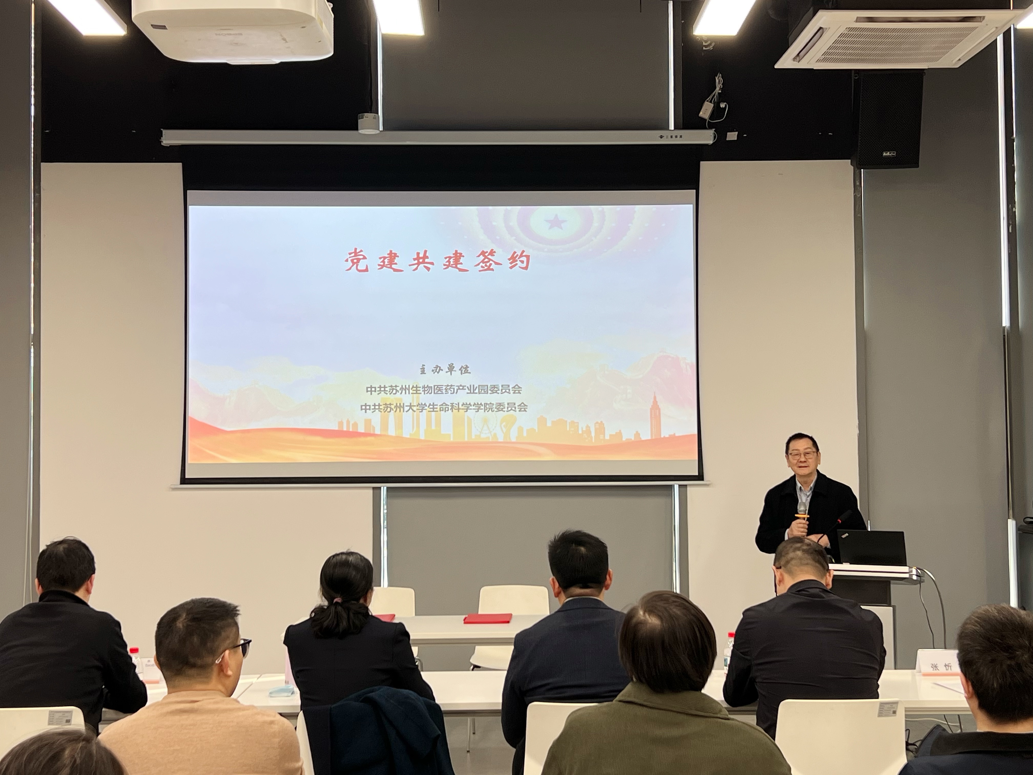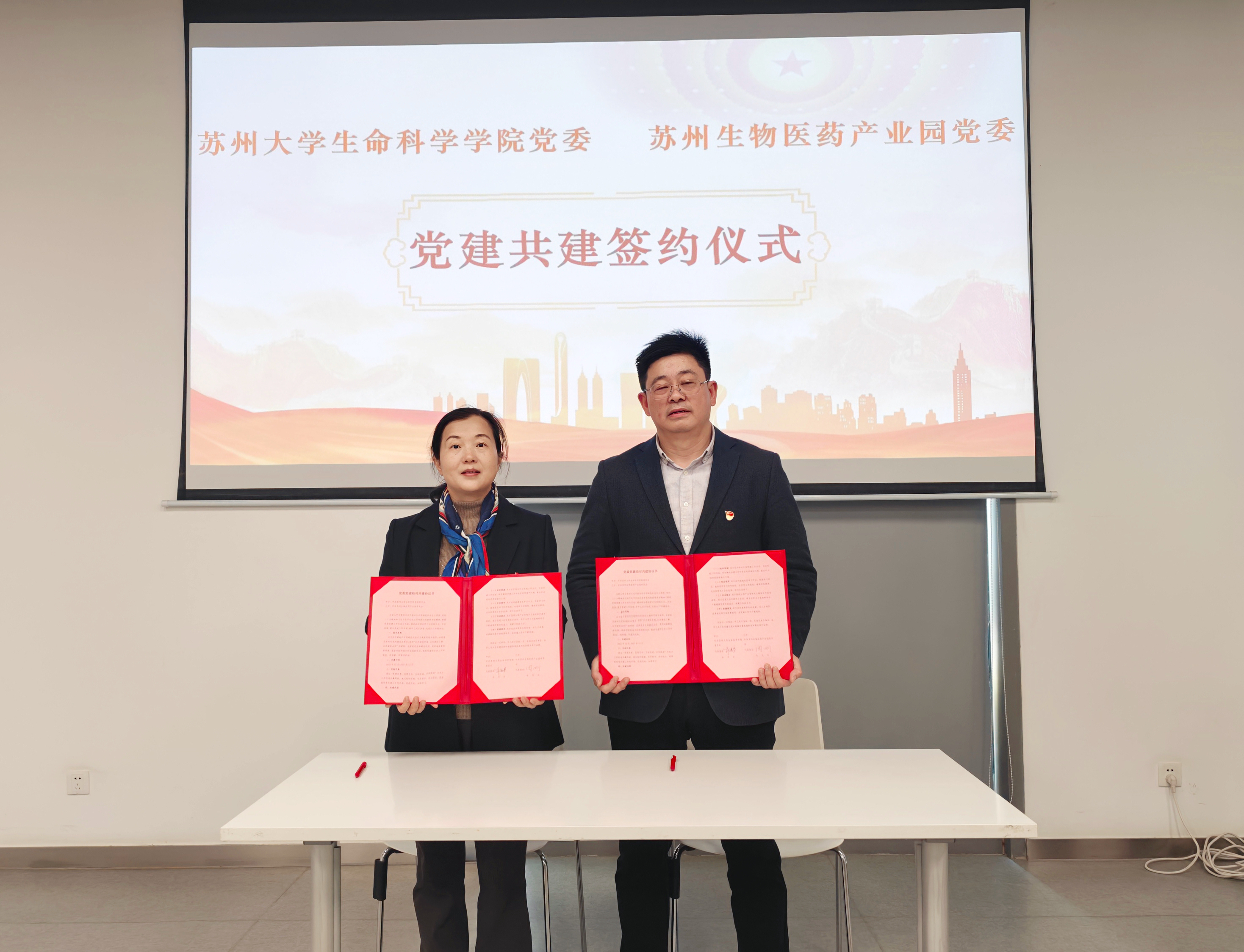 签约仪式在苏州生物医药产业园举行。生命科学学院党委书记许继芳、苏州工业园区生物产业发展有限公司党委副书记周刚代表双方签署共建协议。苏州大学生命科学学院副院长苏雄、和天旭,院长助理张乐帅,各教工党支部书记、教授代表,以及苏州生物医药产业园党委副书记张忻等双方党员代表、企业代表共同出席活动。