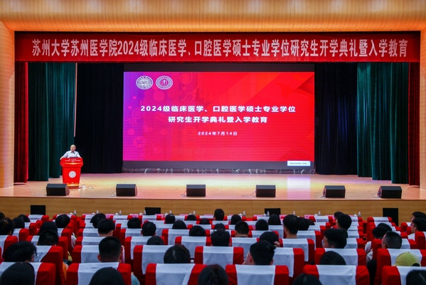 7月14日下午,苏州大学苏州医学院在苏州大学天赐庄校区存菊堂举办2024级临床医学、口腔医学硕士专业学位研究生入学教育活动。苏州医学院教育教学办公室、学生工作办公室(研究生)相关负责人、附属医院专兼职辅导员,以及722名2024级临床医学、口腔医学硕士专业学位研究生参加活动。活动由苏州医学院党工委副书记吴德建主持。
