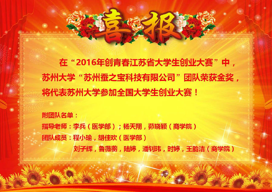 5月27-29日,2016年“创青春”江苏省大学生创业大赛在南京林业大学举行,我院李兵教授的成果“家蚕多功能饲料添加剂的产业化应用”获得了金奖,该项目将参加2016年“创青春”全国大学生创业大赛。