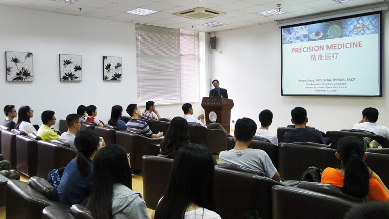 简单而隆重的授聘仪式后,由Fung教授为到场师生作关于“精准医疗”的学术报告。他从概念、现状、应用、机会与挑战等方面入手,与在座师生作了精彩分享。Fung教授从几位患癌明星的不同诊疗方法开门见山,引出了医疗模式的转变方向与发展趋势。精准医疗,是一种建立在了解个体基因、环境以及生活方式基础上对疾病全面认识并提供更为新型且适宜的预防和诊疗方法。“精准医疗的目标,是要克服千人一方、万人一药的瓶颈问题”,Fung教授形象地说道。的确,目前市面上使用的许多治疗药物,受益的人十分有限,有些甚至是有害健康的。根据患者个体的不同特征,量体裁衣式地制定具有个性化的治疗方案是未来医学发展的目标。与传统医学的被动医疗相比,精准医疗采用健康管理的理念,主动预测、预防和早期发现、治疗,也将成为未来医学发展的主流方向。面对精准医疗现如今遇到的各种挑战,Fung教授也提出了自己的见解。他认为,精准医疗作为一种新方法来整合最新技术用以实现个性化医疗,是必须并且必要的。面对挑战,政府、医疗人员、患者、家属等在内的多方群体,都要不断进行无论是专业知识上的内化,还是外在沟通上的磨合。总之,精准医疗无论对于社会还是对于人类进步都是大势所趋,我们不能错失发展的机遇。