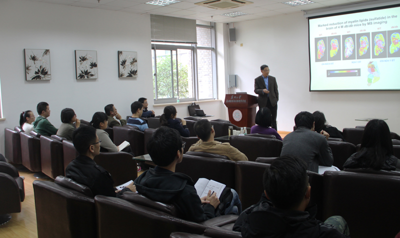 本次论坛,韩教授给与会者带来了题为“Altered lipid metabolism as revealed by lipidomics: the potential mechanisms responsible for diabetic neuropathy and anesthetic-induced neurotoxicity”的精彩报告。韩教授二十多年来一直致力于脂质组学方法学的开发和应用,建立了多维质谱MDMS-SL法脂质组学分析技术,在对该技术作了简要介绍后,他从实验室主要研究领域入手,为大家解析了他们是如何从脂质代谢紊乱角度对老年痴呆症、麻醉引起的脑损伤以及糖尿病诱发的心肌炎进行病理研究的。韩教授指出,机体内存在数千种脂质分子,它们的代谢通过许多的信号通路和网络相互交织在一起,这些网络可以响应细胞环境的改变。检测这样的改变,了解相关信号通路对于充分认识细胞代谢至关重要。这样的需求催生了脂质组学的出现,促进利用一些分析化学方法来开展大规模的脂质研究。由于质谱分析法的分析能力以及一些新设备与技术的快速发展,质谱被广泛地应用于脂质组学中,大大加速了这一领域的发展。韩教授还描述了可以帮助我们认识代谢信号通路的一些常见而重要的细胞代谢网络,并重点介绍了脂质组学在研究脂质代谢和代谢疾病中的一些典型应用,以及未来脂质组学在研究代谢信号通路中的应用。