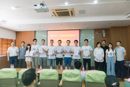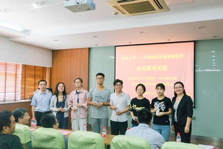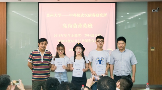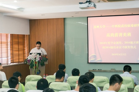 关武祥代表武汉病毒研究所致辞,祝贺毕业班同学顺利完成本科学业,开启新的人生篇章,希望同学们继续延续菁英精神,成为社会栋梁;希望获奖同学能继续努力、不断突破,同时欢迎2016级同学的加入,希望同学们秉承高尚荫菁英班的优良作风,吸收苏州大学与武汉病毒研究所的精华,提升自我,成就未来更加全面的自我。他表示同学们对知识的渴望,也是研究所和苏州大学不断努力前行的动力,我们将不断创新合作方式,共同开创科教融合新篇章。 “高尚荫菁英班”2017-2018学年奖学金颁奖、2016级开班暨2014级培养证书颁发仪式在掌声中圆满结束。随后,参会人员和同学们一起合影留念。