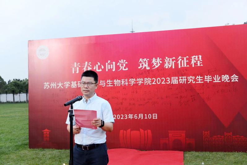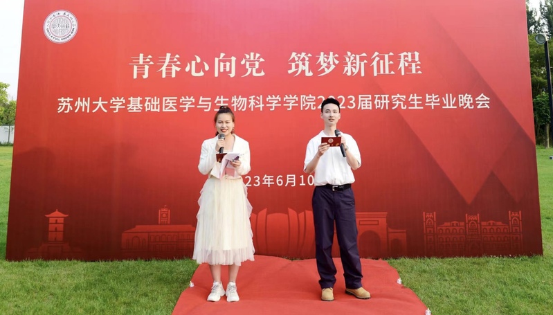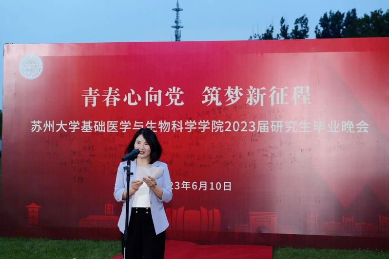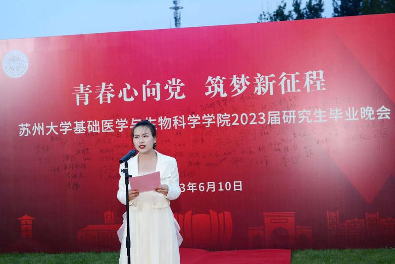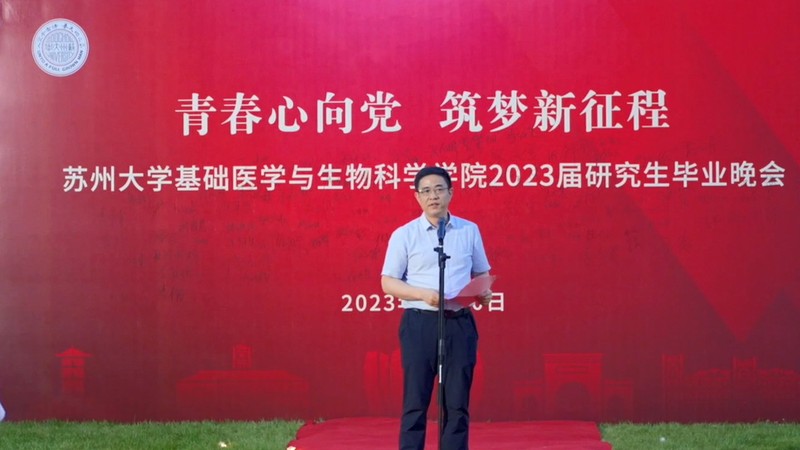 现场大屏幕上播放的毕业季MV记录了同学们入校的情景和成长历程,韶华时光被锁在每一帧画面中;教师寄语和往届师兄、师姐的祝福视频,使毕业氛围不断酝酿“升温”。三年前,基医学子怀揣理想与激情迈入这座充满希望的学府,开启研究生学业的新坐标;三年来,明确规划,学习、科研常常“内卷”。同学们经历过抗击新冠疫情的艰辛、考试受挫的沮丧;也体会了重返校园的激动,顺利通过答辩的欣喜;将青春与生机化作了学习室里始终亮着的灯光,实验室里一丝不苟的严谨,运动场上热血沸腾的呐喊……用青春和芳华编织了一道靓丽的风景线!三年后,相依相伴的苏大,即将成为母校,春樱、夏荷、秋枫、冬雪,钟楼、尊师轩、情人坡、炳麟图书馆……相信母校的一草一木、一砖一瓦、一楼一河,都已深深印在大家的心中。