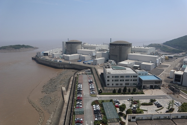 参观的第二站安排在秦山核电站三期。三期是中国和加拿大合作建立的两个60万千万时重水反应堆,是国际上首个把压水反应堆的回收铀再用于重水反应堆发电。站在核电三期办公楼的顶楼,核电站三期反应堆的雄姿一览无余。