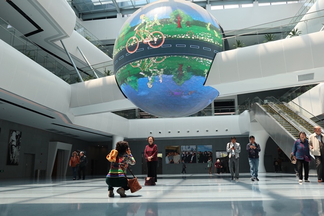 进入核电科技馆内,直径近8米的亚洲最大室内LED球屏位于展馆中枢,不断变换的主题一下子吸引了大家的目光,大家纷纷掏出手机、相机留影。