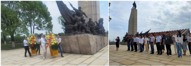 双山渡江战役纪念碑位于张家港双山渡江战役胜利公园内。1949年4月21日,中国人民解放军百万雄师在西起九江,东至张家港双山的千里战线上,横渡长江,挥师南下,历时42天,解放了南京、上海、武汉等大城市。双山是人民解放军渡江战役的最东线战场,经过一夜激战,数十名解放军指战员在战斗中壮烈牺牲。今天,我们来到当年英雄的作战地点,满怀对英雄的崇敬之情,全体师生唱起了庄严的中华人民共和国国歌,并向革命烈士鞠躬、默哀,由4名党员代表向先烈们敬献花篮,缅怀先烈的英雄事迹。在纪念碑前,全体党员面对鲜红的党旗,重温入党誓词,庄严承诺,坚定决心,牢记共产党员的政治责任和历史使命。