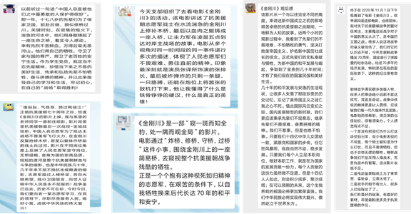 电影《金刚川》以1953年金城战役为背景,讲述了志愿军以血肉之躯护桥英勇渡江的事迹。影片从士兵、对手、高炮班和桥四个视角展开,塑造了抗美援朝战士们的忠心赤胆,充满着奉献、英勇为国的民族情怀。观影期间,师生党员被志愿军战士舍生忘死,同仇敌忾的大无畏精神所感动,潸然泪下。