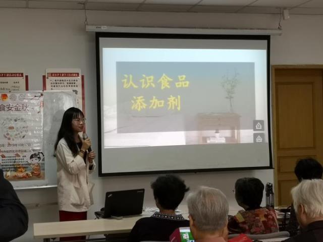 接着PPT组的同学开始了第二个主题----食品添加剂的科普。讲解的同学先是讲述了什么是食品添加剂,介绍了几个大众关于食品添加剂的常见误区,将食品添加剂与三聚氰胺、瘦肉精等非法添加有害物质区别开来。随之还介绍了食品添加剂的分类以及食品添加剂的作用。老人们都听得很认真,相信以后他们一定会正确看待食品添加剂。