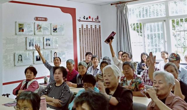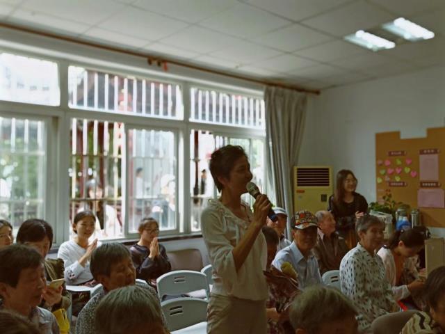 之后,互动组插入了“听歌识曲”小游戏。活动现场先播放歌曲,再进行抢答,抢到且答出名字或者可以唱出两三句就能获得奖品。选取的歌曲都是老人们耳熟能详的,并且契合了刚刚过去的国庆七十周年盛典,现场气氛十分活跃。游戏进行到最后,在主持人的带领下,老人们一起合唱着他们那个年代的歌谣。