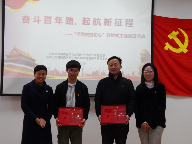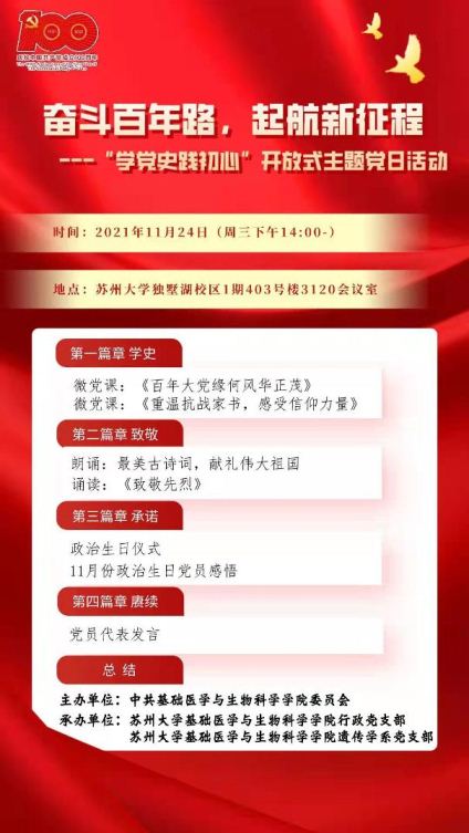 为庆祝中国共产党百年华诞,进一步推进党史学习教育,兼顾高校教育本位及科研使命,践行共产党员初心,11月24日下午,行政党支部和遗传学系党支部联合举行了“学党史,践初心”开放式主题党日活动。本次党日活动包含了党史学习的“学史”、挖掘红色资源的“致敬”、党员践行初心的“承诺”以及党员学史力行的“赓续”等内容,以诵读、微党课、党员发言、给党员过政治生日等形式开展。
