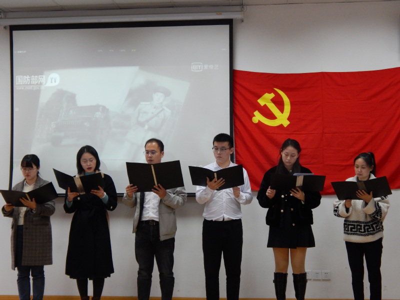 我们每一位党员都有两个生日,一个是自然属性,昭示着“生命的开始”,是生身父母给予的;另一个是政治属性,代表着“初心与使命”,是党组织给予的。我们不能因为走得太远,而忘记为什么出发。对于党员来说,不忘初心、牢记使命,方能艰苦奋斗,永葆本色。在第三部分“承诺”环节,支部给11月份政治生日的两位党员送上贺卡和镌刻着“不忘初心、牢记使命”的笔记本。希望两位党员每次看到笔记本都会进一步增强党员身份意识,提升党员的使命感、归属感和幸福感。学院办公室主任陈玉华老师深情地回忆起自己入党时的情景,时间飞逝,今年已经是自己的第28个政治生日,但自己入党时的那份初心依然坚定。博士一年级研究生靳二锁激动地表示,自己的生日和政治生日恰好为同一天,这一直是自己引以为豪的事情。入党誓词,是每个共产党员对党和人民做出的庄严承诺。在“承诺”环节,由党委书记何峰领誓,党员们面朝鲜红的党旗,举起右手,庄严宣誓,向党旗许下郑重的承诺。