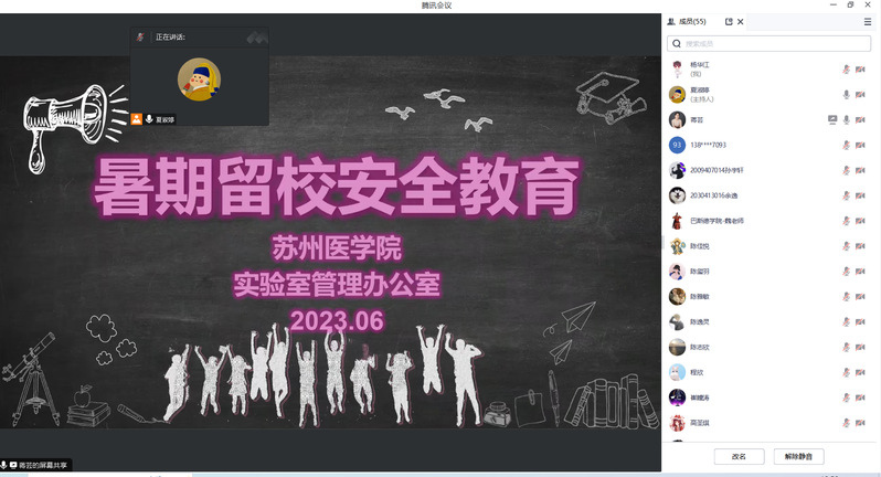 6月30日,为了提高师生安全防范意识,保障留校学生暑期安全,根据学校《关于做好暑期安全工作的通知》相关精神,巴斯德学院举办了暑期安全教育讲座。此次讲座采用线上的形式,邀请了苏州医学院安全委员会蒋芸老师主讲。讲座由学院办公室夏淑婷老师主持,全院教职工、研究生和本科生参加了此次活动。