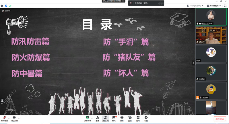 讲座围绕着暑期留校安全问题展开,首先从防汛防雷出发。夏天是雷雨多发季节,在保障个人安全的同时,还要维护实验室内的设备不受雨水、雷电影响。接着是防火防爆篇,蒋芸老师为我们介绍了容易起火的几种方式、预防措施以及发生火灾后如何报火警;在防中暑篇中,蒋老师分别从中暑的病因、措施、症状等方面入手,这些详细的信息有助于我们在高温季节有效地预防中暑,并在必要时采取正确的紧急救治措施;防“手滑”、防“猪队友”篇主要针对实验室安全,要多一点细心,多一点耐心,多一点责任心,注重细节到位,养成良好的实验室习惯,规范实验操作;防“坏人”篇中,蒋老师结合实际案例和经验,介绍了实验室中的“国家安全”,为参会人员提供必要的安全教育指导。讲座尾声,蒋老师还进行了在线测试,进一步提高了安全教育的实效。